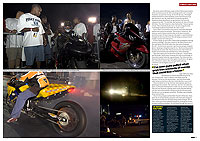 “Sure I been lain down on the side of the road with a gun against my head, had my bike confiscated by the police and seen friends killed street racing,” says Rickey Gadson, a slightly built racer with bright orange wraparounds, a raffish diamond earring and a thinly disguised fierce demeanor. He is probably one of the most famous street racers. He acted as consultant and as a stunt rider on the film Biker Boyz and was even sponsored by Kawasaki for short while. “Course I had to stop street racing then,” he says. Although the most street racers get is a ticket for a few hundred dollars if caught, worse is the fear of having their motorcycles confiscated. And then there is the danger too. Gadson lost a close friend when he ploughed into a group of spectators at the side of the road in a street race as more often than not headlights aren’t used.