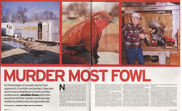 Indeed, it seems odd that while it is a felony conviction to fight a chicken against another, 8 billion chickens are killed every year in the US to feed a population that gorges itself on Kentucky Fried Chicken and Chicken McNuggets. While preparing this piece I emailed and called five or six of the biggest chicken producers in the US asking to look round a legitimate poultry factory. Not a single one replied to let me see for myself how chickens are legally slaughtered. However, it is known that birds are reared to five months, and then packed off to the factory where they are hung upside down on a conveyor belt and slowly fed into a machine which slices their heads off. It was easier to get into a felonious cockfight than to see the how a chicken burger is made.
