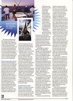 A day later the After Midnight crew were warned to stay out of town and certainly not to wear the boat’s T-shirts. Russ disappeared and everyone feared he had been kidnapped by Mexicans and held to ransom in a bid to get the prize money. Other rumours were that the organisers had been attacked. And indeed, as we walked back from a bar one night the occupants of a passing car hurled a bottle at us. There were allegations that the only reason the After Midnight had won was because they had a journalist on board and it was good publicity for the tournament. My chances of being on the winning boat, after all, were at least 234 to one. All boats while trolling for marlin had gone far enough to circumnavigate the globe twice and only 250 billfish were caught in the whole tournament. Others claimed the After Midnight had cheated and I had been paid off to turn a blind eye. All lies, but the controversy deepened. I remembered what Charlie from Oregon had told me, “Sure I love fishing but there’s nothing like fishing for a million dollars though.”